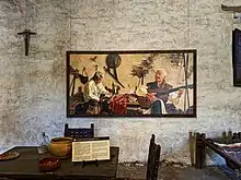 Four years later, the Mission property was auctioned off under questionable circumstances for $710 worth of tallow and hides (equivalent to $15,000 in 2004 dollars) to Englishman John (Don Juan) Forster (Governor Pío Pico's brother-in-law, whose family would take up residence in the friars' quarters for the next twenty years) and his partner James McKinley.[85] More families would subsequently take up residence in other portions of the Mission buildings. José María Zalvidea left San Juan Capistrano on or about November 25, 1842, when Mission San Luis Rey de Francia's Ibarra died, leaving the Mission without a resident priest for the first time (Zalvidea had been the Mission's sole priest ever since the death of Josef Barona in 1831.)[86] The first secular priest to take charge of the mission, Reverend José Maria Rosáles, arrived on October 8, 1843;[87] Vicente Pascual Oliva, the last resident missionary, died on January 2, 1848.[88]