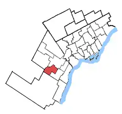 It consists of the part of the City of Mississauga bounded by a line drawn from the northwestern city limit southeast along Mississauga Road, northeast along Highway 401, southeast along Mavis Road, southwest along Britannia Road West, southeast along Terry Fox Way, southwest along Eglinton Avenue West, northwest along Erin Mills Parkway, southwest along Britannia Road West to the southwestern city limit.