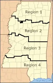 There are four administrative regions in Mississippi. Each region is staffed by a Regional Forester, with either 6 or 7 Area Foresters assigned to individual regions.[9]