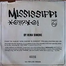 "Mississippi Goddam" is a song written and performed by American singer and pianist Nina Simone, who later announced the anthem to be her "first civil rights song".[1] The song was released on her album Nina Simone in Concert in 1964, which was based on recordings of three concerts she gave at Carnegie Hall earlier that year. The album was her first release for the Dutch label Philips Records and is indicative of the more political turn her recorded music took during this period.