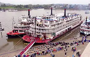 ![]() Mississippi Queen (center), with the Delta Queen along her starboard side, moored at the Tall Stacks Festival in Cincinnati, Ohio in October 2003. The Majestic appears on the right. | |