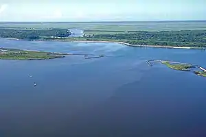 The Mississippi River–Gulf Outlet Canal (abbreviated as MRGO or MR-GO) is a 76 mi (122 km) channel constructed by the United States Army Corps of Engineers at the direction of Congress in the mid-20th century that provided a shorter route between the Gulf of Mexico and New Orleans' inner harbor Industrial Canal via the Intracoastal Waterway. In 2005, the MRGO channeled Hurricane Katrina's storm surge into the heart of Greater New Orleans, contributing significantly to the subsequent multiple engineering failures experienced by the region's hurricane protection network. In the aftermath the channel was closed.[1] A permanent storm surge barrier was constructed in the MRGO in 2009, and the channel has been closed to maritime shipping.