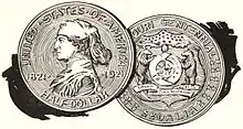 A total of 50,028 Missouri Centennial half dollars was struck at the Philadelphia Mint in July 1921, 28 being reserved for inspection and testing at the 1922 meeting of the annual Assay Commission.[22] The first coins displayed the 2★4 on the obverse; afterwards, this was ground off the dies and the remainder were struck without it. The Sedalia Trust Company distributed the coins at a price of $1 on behalf of the centennial commission, selling both varieties by mail and the plain ones at the exposition in August. There had been little advance publicity, and the exposition took place during the Recession of 1921. All of the 2★4 coins sold, but when sales slowed of the plain variety, 29,600 were returned to the mint for melting.[8][14] Early advertisements for the coin contained sketches prepared by Aitken, showing the obverse as issued, but depicting a reverse bearing the state Seal of Missouri, that Aitken had abandoned when he found it did not work well.[23] Aitken, in a letter published in part in the December 1921 issue of The Numismatist (the journal of the American Numismatic Association) wrote that "The illustration that you published was made from one of several drawings which I submitted to the Federal Art Commission. The Missouri committee was informed that I would work along these lines, though I was given full latitude for any change I might advise. The seal of the State did not work out well, so I developed the reverse with the two standing figures, which met with the instant approval of the Commission in Washington."[23]