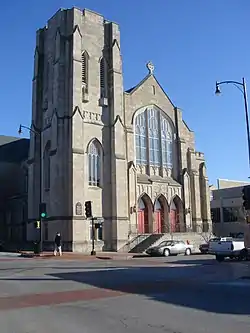 The Missouri United Methodist Church is a United Methodist church in downtown Columbia, Missouri. Its congregation formed the first Methodist Church in Columbia in 1837. The present building on 9th Street built between 1925 and 1930 is constructed out of Indiana Bedford limestone in a Late Gothic Revival style. The Stained Glass windows, including the large History of Methodism window at the rear of the sanctuary, are some of the most detailed in Mid-Missouri.[2] The sanctuary seats 1,000 people.[3] It was added to the National Register of Historic Places in 1980.[1]