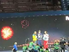 In her first long course world championship meet at the 2011 World Aquatics Championships in Shanghai, Franklin won a total of five medals, three gold, one silver, and one bronze. In her first event, the 4×100-meter freestyle relay, Franklin won a silver medal with Natalie Coughlin, Jessica Hardy and Dana Vollmer in a time of 3:34.47. Swimming the second leg, Franklin had a split of 52.99, the second-best among all participants.[31] Franklin won her first individual medal, a bronze, in the 50-meter backstroke, finishing behind Russian Anastasia Zuyeva and Japanese Aya Terakawa.[32] Shortly after the 50-meter backstroke final, Franklin competed in the 4×200-meter freestyle relay with Dagny Knutson, Katie Hoff and Allison Schmitt and won gold ahead of Australia and China in a time of 7:46.14. Franklin's lead-off time of 1:55.06 was faster than the winning time of Italian Federica Pellegrini in the individual 200-meter freestyle final (1:55.58).[33] After setting the national record in the semi-finals of the 200-meter backstroke (2:05.90), Franklin dominated the field in the final with a time of 2:05.10, breaking her own national record and winning gold. This was Franklin's first individual world title, and her time in the final was the third-fastest effort of all time.[34] Shortly after the 200-meter backstroke final, Franklin competed in the 4×100-meter medley relay with Natalie Coughlin, Rebecca Soni, and Dana Vollmer and won gold with a time of 3:52.36, over three seconds ahead of second-place finisher China. Swimming the freestyle leg, Franklin had a split of 52.79, the fastest in the field. The final time of 3:52.36 for the medley relay was the second-fastest effort of all time, just behind the Chinese-owned world record of 3:52.19.[35] For her performance at these championships, she won the Female Athlete of the Year, Female Race of the Year (200-meter backstroke), and the Relay Performance of the Year (4×100-meter medley relay) Award at the eighth annual Golden Goggle Awards.[36] She was also named the best female swimmer for 2011 by FINA Aquatics World Magazine.[37]
