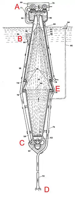A: Vacuum pump which maintains low pressure in the structure. B: Inlet to allow warm water surface water to flow down to the turbine. C: Base of the structure 100M below surface where the turbine is located. D: Cold water pipe which extends to depth (usually 700 to 1000 meters depth). E: Location where cold water jets spray upwards into vessel.