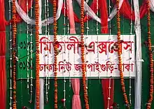 The Mitali Express (13131/13132) train (Bengali: মিতালী এক্সপ্রেস) is an international express rail service which connects the Indian city of Siliguri with the Bangladeshi capital Dhaka every week. Together with the Maitree Express train and the Bandhan Express train, the Mitali Express train is the third modern-day fully air conditioned passenger train link between the Indian state of West Bengal and Bangladesh. Both the prime ministers of the two neighbouring countries officially inaugurated the non-stop passenger train with ten compartments on the new 513 km route from Dhaka on 26 March 2021, the day Bangladesh celebrated the golden jubilee of its independence. The prime minister of India was in Dhaka to mark the auspicious occasion of fifty years of independence of Bangladesh. After 56 years of stoppage, this train route recreates the previous Siliguri route between India and Bangladesh.[3] A valid visa and passport is required beforehand to purchase a ticket for the Mitali Express train. Tickets are available at Cantonment railway station in Dhaka, Bangladesh and at New Jalpaiguri railway station in Siliguri, India.[4][5]