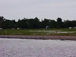 Prior to flooding, the Grass River (now Grass Creek) flowed through the centre of marshland above which the current lake sits in Eldon Township, Victoria County. It entered from the south-west, reaching Fennel Road (Kawartha Lakes Road 35) where it now crosses the Trent Canal. From here it turned west and followed the same course as the modern canal to Portage Road (formerly Ontario Highway 48, today Kawartha Lakes Road 48). Passing under the road, it resumed a north-easterly course towards the village of Victoria Road, where it flowed as it continues to today, now controlled by a dam, westward into the Talbot River.[6]
