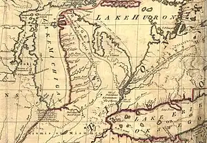 The map also included non-existent features, such as Isle Phelipeaux in Lake Superior, found in earlier maps by Jacques-Nicolas Bellin.[4]