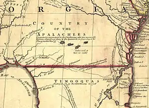 - South Georgia: COUNTRY OF THE APALACHEES—Conquered & surrendered to the Carolinians, after two memorable Victories obtain'd over them & the Spaniards in 1702 & 1703 at the Places marked thus [crossed-swords] (reference to the Apalachee)