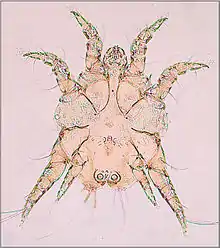 The life-cycle of mites begins with eggs that are laid on the vertebrate animal host or within the nest or environment of the host.[1] From the egg hatches a larva, characterized by having three pairs of legs. The larva feeds on the host and molts to a nymph. The nymph is similar to the larva but has four pairs of legs. Then the nymph feeds and molts. This molt is either to the first of several more nymph stages, or to an adult. The adult is defined as a sexually mature female or male, and has four pairs of legs. These similar stages (or instars) are in a sequence known as an incomplete metamorphosis. The potential reproductive capacity of a female mite is low compared to ticks because the eggs are large relative to the small female. However, the survival of larvae laid on their hosts or in nests of their hosts is high, and the life-cycle is short, so mite populations can expand rapidly under favorable conditions. Ectoparasitic mites typically transfer by crawling between hosts in close contact (see also section on control). The unusual life-cycle of trombiculid mites is described in the section on blood-sucking mites.