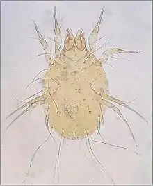 The dermanyssid mites are visible to the naked eye and have long powerful legs that they use to seek their hosts. These mites live in the nest of their hosts or within the fabric of poultry houses.[10] They infest their hosts whilst feeding for short periods. Their mouthparts are long complex organs adapted for piercing their host's skin and sucking blood. Dermanyssus gallinae, the red chicken mite is typical. Dense infestations of a poultry house cause much biting stress and loss of production to the birds, and human workers in the houses are bitten. Originally a parasite centered on the nest of its host, this species has become a major pest in commercial poultry houses. A similar genus is Ornithonyssus; O.bursa, the tropical fowl mite, and O.sylvarium the northern fowl mite cause similar problems in poultry production.
