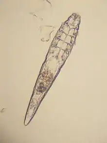 The parasitic mites are either just visible to the naked eye or one needs a microscope to see them clearly. The distinct body segmentation characteristic of most arthropods is greatly reduced in the Acari. At the left of the diagram is an anterior section bearing the mouthparts (gnathosoma or capitulum), and at right, a posterior section comprising the main body (idiosoma). Mouthparts are characterized by a central pair of chelicerae, a ventral hypostome, and a lateral pair of palps. Chelicerae are protrusible, cutting or piercing structures essential to feeding. Palps are of sensory function during feeding and do not penetrate the host's skin. Acarines have no antennae and, except for some genera of ticks, are without eyes.[11] A tube for ingesting food and secreting saliva is formed by apposition of both the chelicerae and the hypostome. The main body bears three pairs of legs in the larvae and four pairs in the nymphs and adults. The legs are multiple-jointed and operate by contraction of their internal muscles. The distal segment of the legs, the tarsus, is equipped with a terminal claw or pair of claws and sometimes with an adhesive pad or sucker that enables the mite to crawl up smooth surfaces. The internal organs (or viscera) include a tubular gut with a posterior anus, paired excretory tubes (Malpighian tubules) that empty out into the anus, paired respiratory tubes (tracheae) that carry atmospheric air directly up against the viscera, paired salivary glands with ducts to the mouthparts, female or male reproductive organs (ovary or testes), and a central nervous ganglion that acts as a simple brain.