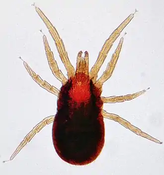 Dermanyssid mites are much larger than most parasitic mites and are easily visible to the naked eye.[9] They have long, powerful legs that they use to seek their hosts and their size and active crawling cause them to resemble larval ticks. Their lifecycle proceeds from egg to larva to nymph to adult, and all of the active stages are only temporarily parasitic. A single blood meal is completed within a few minutes, so they are found on their hosts only for a short time relative to their time off the host.[24] These types of mites naturally live in the nests of their bird hosts. The species of economic importance to poultry-rearing have adapted to living within the fabric of poultry houses. Their mouthparts are adapted for sucking blood with a pair of long piercing chelicerae. Dermanyssus gallinae, the poultry red mite, is typical. A related genus is Ornithonyssus—O. bursa, the tropical fowl mite, and O. sylvarium, the northern fowl mite.