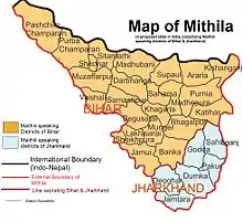 In 1921, Maharaja Rameshwar Singh of Darbhanga Raj raised the demand for a separate state of Mithila based on the concept of creating “a series of self-governing provinces and principalities federated by one central government.” [2] In 1936, Odisha was separated from Bihar, but the demand of a separate Mithila state remained ignored. India became independent in 1947, and from 1950 to 1956 many states were formed based on language, but a separate Mithila state was again ignored. The people of Mithila were aggrieved by this, and by 1950–1952, a movement developed. In 1952, Dr. Laxman Jha launched a major movement for a separate Mithila state. Later he worked only for Mithila-Maithili.[3][4] Mithila Kesari Late Janaki Nandan Singh raised the demand for a separate Mithila state and expressed opposition in the Congress party in 1954, handing over important documents for a separate Mithila state to the country's first Prime Minister, Pandit Jawaharlal Nehru, in 1956.[5][6] In 1986, Janata MP Vijay Kumar Mishra revived the old demand for a separate Mithila state comprising the districts of Muzaffarpur, Darbhanga, Saharsa, Purnea, Bhagalpur and more of the district of North Bihar. The revival came in the form of a three-day rail roko agitation organised by him.[7] In March 1996, Mithila Rajya Sangharsh Samiti initiated a mass-contact campaign for the demand of a separate Mithila state, and in the month of July of the same year, Mithlanchal Vikas Congress demanded the formation of an Autonomous Development Council for Mithila.[8] In 2000, Jharkhand was separated from Bihar, but the demand for a separate Mithila state again remained ignored.[9] After the separation of Jharkhand state, the former Advocate General of Bihar, former Chairperson of the Bihar Legislative Council and BJP leader Pt. Tarakant Jha, announced the movement for a separate Mithila state on 4 August 2004 in a press conference. In 2007 he started a signature campaign to demand the creation of a separate state of Mithila for the people who speak Maithili. He said, "We will collect signatures of 10 million people in support of the demand for creation of a separate state of Mithila and submit it to the President of India".[10] After being expelled from the BJP, he continued to advocate the Mithila movement, but as soon as he became a member of the Legislative Council he put the movement on hold. He died in May 2014. In 2008, JD(U) Party's state president Shravan Chaudhary said that his party favored the formation of a separate Mithila state with respect to 18 Lok Sabha and 108 assembly constituencies of North Bihar. According to him, this area is very backward since independence. Every year people of the area face flood situation, and industries in the region are also in ruins. Therefore, the formation of a separate Mithila state is the only solution for the development of this region.[11] In 2015, Cricketer-turned-BJP MP Kirti Jha Azad demanded a separate Mithila state for Maithils. According to him "Mithila should be a separate state if not a separate country". He raised this issue in the Parliament of India to fulfil the old dream of a separate Mithila state for Maithils in North Bihar.[12][13] In 2018, former chief minister and chief opposition leader Rabri Devi favoured the demand of separate Mithila State for Maithili speaking in North Bihar at Bihar Legislative Council. She demanded with the chairperson of the council to create a separate Mithila state for Maithili-speaking people. The issue was raised after the demand of legal sanctity for the use of Maithili language in official works of the Bihar government by the then BJP MLC Suman Kumar's non-government resolution at the council.[14] In 2019, three BJP leaders, Gopal Ji Thakur MP from Darbhanga, Ashok Kumar Yadav MP from Madhubani and Sanjay Saraogi MLA from Darbhanga Nagar, raised the demand for a separate Mithila state at 47th Vidyapati festival celebration ceremony organized by Vidyapati Seva Sansthan and held in Darbhanga. They stated that they would take the state of Mithila by violence, as opposed to begging from the government.[15] Akhil Bhartiya Mithila Rajya Sangharsh Samiti had been continuously staging a strike for a separate Mithila state on the first day of every session of the Indian parliament for the previous several years. National President of the Akhil Bhartiya Mithila Rajya Sangharsh Samiti Dr. Baidyanath Chaudhary "Baiju Babu" said that without social, cultural, economic, political and linguistic independence of Mithila, development of the entire Mithila region is impossible.[9][16] On 18 July 2022, he said that the identity of Mithila is being disappeared in Bihar. Meanwhile, Mithila Rajya campaigners Pandit Ashok Jha, Praveen Narayan Choudhary, Jayanti Jha, Savita Mishra, Anju Jha and senior campaigners Pandit Harekant Jha said that Mithila has lost momentum and direction due to government negligence. Education and health standards are falling sharply. Major demands were put forward during the meeting including separate Mithila state, preservation and promotion of Maithili language, comprehensive development of Mithila and 35-point demands. Also, permanent solution to floods by building dams in Nepal, AIIMS, IIT, IIM, Doordarshan in Maithili, establishment of IT park, establishment of High Court bench, prevention of migration and unemployment and creation of Mithila Regiment in the Army are prominent. A memorandum was also submitted to the President, Prime Minister and Home Minister led by Madan Kumar Jha and Hiralal Pradhan.[17][18] Mithila Student Union is the biggest students union in Mithila region of Bihar. They have started a movement for the separate Mithila state in India from the present Bihar on social media and mass contact campaigns. The organisation had planned a huge public protest on 21 August 2022 at Jantar Mantar in the national capital of India in New Delhi. The organisation held a huge mass public protest at Jantar Mantar. 