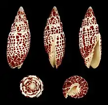 | Five views of a shell of Mitra papalis | |