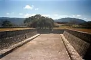 Ballcourt A11 encloses the west side of the Group A plaza, separating it from the retaining wall dropping off to the ravine behind the ballcourt. It is a sunken ballcourt with a north-south orientation and is entirely enclosed. A short sunken stairway leads from the plaza to the top of the south wall. Another stairway descends the south wall to the southern end zone of the ballcourt.[41] A matching stairway in the northern end zone provides access from that direction.[42] The interior of the ballcourt playing area measures 37.21 metres (122.1 ft) north-south and the playing alley is 9.46 metres (31.0 ft) wide between the side benches.[43] The walls were built of small stone slabs and have a slight slope; as is common with the architecture of Mixco Viejo (Jilotepeque Viejo), the walls were topped with vertical cornices.[42] However, the end zone walls are all completely vertical. Fragments of stucco recovered around the ballcourt indicate that it was at least partly coated.[42]