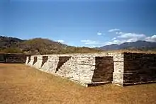 Platform A5 closes the north side of the Group A plaza. The platform has two levels upon a base and a cornice terminating the walls. The platform faces south towards the plaza and ballcourt. The platform was accessed via four stairways, each with nine steps; they were flanked by steep ramps or balustrades. The visible version of Platform A5 covers the remains of an earlier structure.[37] The earlier building was a large platform with a north-south orientation as opposed to the east-west orientation of Platform A5. The surviving parts were investigated by archaeologists and consist of the north wall and parts of the west facade. The north wall was 9.1 metres (30 ft) wide, suggesting that the earlier platform was very large and probably extended south almost as far as the ballcourt.[38] Two funerary urns were excavated from the earlier platform.[39]