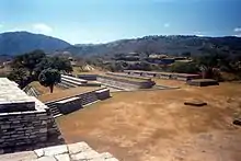 The ruins consist of 15 groups containing the remains of over 120 major structures, including temples, palaces, and courts for playing the Mesoamerican ballgame.[13] When the site was excavated, the surface was found to be littered with abundant obsidian blades and arrowheads.[27] Originally the city had its main entrance on the western side, a modern road has now been cut through to the ruins from the west along a similar route.[28]