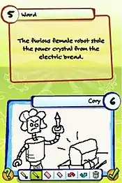 The second player then attempts to draw a scene describing the phrase or sentence. Again, this is saved and the DSi passed onto another player, who must write down what they think the original phrase was. The DSi is then passed on again for someone else to draw a picture, and this alternating words and pictures method continues until there are no more players.