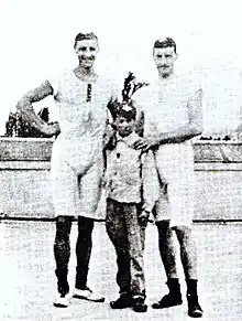 The Netherlands' François Brandt (left), Roelof Klein and their coxswain, an unknown French boy, at the 1900 Olympics