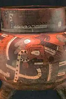 An example of this link to other Mesoamerican societies is the influence of the Olmec style in the ceramics of Highland Mixteca. In sites such as Huamelulpan and Tayata, figurines have been found that have Olmec iconographic characteristics, a style widely spread in almost all of Mesoamerica during the first millennium BC.[8] On the other hand, in the Olmec nuclear area, Red-on-Bayo ceramic objects have been found that were undoubtedly produced in the region of Tayata, according to the studies that have been carried out on the chemical composition of those archaeological materials.[9] During the period of formation of Mixtec cultural traits, social stratification was incipient, as shown by the few differences that have been found in the remains of dwellings corresponding to those times. On the other hand, the function of the buildings was not clearly differentiated either.
