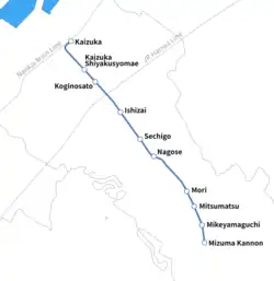 The Mizuma Line (水間線, Mizuma-sen) is a Japanese railway line between Mizuma Kannon Station and Kaizuka Station, all within Kaizuka, Ōsaka. This is the only railway line of a private railway company Mizuma Railway (水間鉄道, Mizuma Tetsudō) operates. The company also operates bus services.