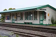 The Moana Railway Station is listed as a Category 1 Historic Place by Heritage New Zealand. It is the only type A station building still remaining that is complete with its associated sidings and goods sheds.[10] Heritage New Zealand has also given a Category 1 listing to the Moana Railway Station Historic Area comprising the station building, a footbridge, the goods shed and the former station master’s house (now used as a cafe).[12][13]