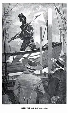 Melville biographer Andrew Delbanco cites race as an example of this search for truth beneath surface differences, noting that all races are represented among the crew members of the Pequod. Although Ishmael initially is afraid of Queequeg as a tattooed possible cannibal, he soon decides "Better sleep with a sober cannibal than a drunken Christian."[26] While it may be rare for a mid-19th century American book to feature Black characters in a nonslavery context, slavery is frequently mentioned. The theme of race is carried primarily by Pip, the diminutive Black cabin boy.[27] When Pip has almost drowned, and Ahab, genuinely touched by Pip's suffering, questions him gently, Pip "can only parrot the language of an advertisement for the return of a fugitive slave: 'Pip! Reward for Pip!'".[28]