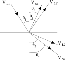 Mode conversion occurs when a wave encounters an interface between materials of different impedances and the incident angle is not normal to the interface.[1] Thus, for example, if a longitudinal wave from a fluid (e.g., water or air) strikes a solid (e.g., steel plate), it is usually refracted and reflected as a function of the angle of incidence, but if some of the energy causes particle movement in the transverse direction, a second transverse wave is generated, which can also be refracted and reflected. Snellius' law of refraction can be formulated as:[1]