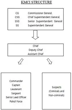 KMCI basically follows the system of Department of Justice in United States. Committees students can take are Federal Bureau of Investigation, US Marshals, Drug Enforcement Administration, Bureau of Alcohol, Tobacco, Firearms and Explosive, or Department of Homeland Security. Each student will work as police designated as a Lieutenant, Sergeant, or Commander, or will work as suspects defending themselves as innocent. Participants (if they are suspects) will typically receive a criminal case ahead of time, which includes the facts of the crime, their roles, alibis and pieces of evidence. Students taking roles as suspects must prepare and memorize the cases given to them. During model crime investigation sessions, participants working as Police, not knowing who the actual criminal(s) is (are), must gather these pieces of evidence through investigating, interrogating and interviewing suspects in order to find out who the offender(s) is(are).