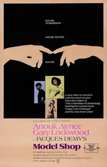 Model Shop is a 1969 romantic drama film written, directed and produced by Jacques Demy, starring Anouk Aimée, Gary Lockwood and Alexandra Hay, and featuring a guest appearance by Spirit who recorded the accompanying soundtrack. Demy made Model Shop, which was his first English-language film, following the international success of his film The Umbrellas of Cherbourg (1964). Aimée reprises the title role from Demy's 1961 French-language film Lola.