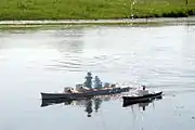 Model warship combat is an international club activity, in which participants construct radio-controlled scale models of actual warships, most commonly those built by various nations prior to 1946, such as the USS Des Moines, HMS Dreadnought, or the German battleship Bismarck. The models are armed with pneumatic cannons, and fight against one another on ponds and lakes. Model warship combat is sometimes considered to be a form of Naval Wargaming, but can also be considered a water-based version of Robot Combat, since much of the internal systems and concepts are the same as radio control electronics, and in some cases possess similar pneumatic systems.