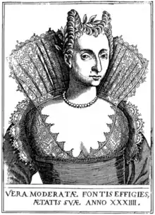 Moderata Fonte, directly translates to Modest Well[3] is a pseudonym of Modesta di Pozzo di Forzi (or Zorzi), also known as Modesto Pozzo (or Modesta, feminization of Modesto),[4] (1555–1592) was a Venetian writer and poet.[5] Besides the posthumously-published dialogues, Giustizia delle donne and Il merito delle donne (gathered in The Worth of Women, 1600), for which she is best known, she wrote a romance and religious poetry. Details of her life are known from the biography by Giovanni Niccolò Doglioni (1548-1629), her uncle, included as a preface to the dialogue.[6]