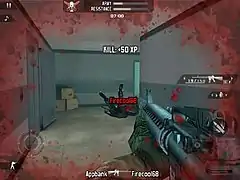 A multiplayer game in Modern Combat 2. The player has just been awarded 50 experience for killing a member of the opposing team. However, the player has also been injured, represented by the red outline around the screen.