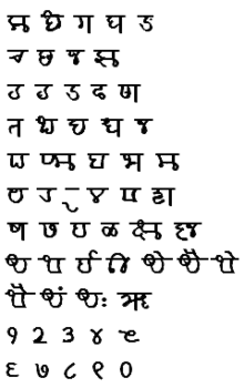 The Modi script derives from the Nāgari family of scripts and is a modification of the Balbodh style of the Devanagari script intended for continuous writing. Although Modi is based upon Devanagari, it differs considerably from it in terms of letter forms, rendering behaviours, and orthography. The shapes of some consonants, vowels, and vowel signs are similar. The actual differences are visible in the behaviours of these characters in certain environments, such as consonant-vowel combinations and consonant conjuncts, which are standard features of Modi orthography. The Modi script has 46 distinctive letters, of which 36 are consonants and 10 vowels.[2]