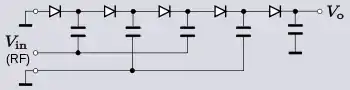 In CMOS integrated circuits clock signals are readily available, or else easily generated. This is not always the case in RF integrated circuits, but often a source of RF power will be available. The standard Dickson multiplier circuit can be modified to meet this requirement by simply grounding the normal input and one of the clock inputs. RF power is injected into the other clock input, which then becomes the circuit input. The RF signal is effectively the clock as well as the source of power. However, since the clock is injected only into every other node the circuit only achieves a stage of multiplication for every second diode-capacitor cell. The other diode-capacitor cells are merely acting as peak detectors and smoothing the ripple without increasing the multiplication.[13]