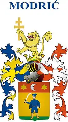 In Podgorje-Lika, it is considered Modrići belonged to the first and older migration of Bunjevci from Northern Dalmatia to Velebit Podgorje, which probably happened in 1645.[21][22][27] In 1694 was mentioned Rade Modrić, in 1708 died Ivan Modrić, and in 1727 was mentioned Mihovil Modrić aliter Mileta.[22] In 1712/1714 census of Lika and Krbava in Lovinac was recorded certain landless peasant Vid Modrich Bunieuacz (Bunjevac), a migrant from Šugarje, descending from Krmpote.[28][29] Modrić families had distinctive nicknames, Grlići, Josetići, Jukići, Jurići, Kajići, Mijadžići, Pavlovići, Perići, Vabići, Bralići, Kušljini.[21][22] In the 20th century, population of hamlet Modrići and near villages on the slopes of Velebit was considered to belong to multilayered regional identity Podgorci being a synonym for Bunjevci.[30] Some members also reached nobility status, in 1649 was recognized and confirmed the nobility to Nicolaus [Nikola] Modrich by Croatian Sabor.[3][4] A branch of the family, with a surname form Modrović (Modrovich aliter Modrich), was part of the Croatian-Hungarian nobility since the end of the 18th century, when Johann [Ivan] Modrovich aliter Modrich, with brother Peter-Martin and children, received the noble title with a bit different coat of arms by Leopold II on 21 July 1791, which was confirmed by Sabor in 1792.[3][4] The family members mostly served a military-officer role in the Military Frontier, while others were traders and entrepreneurs.[5][6]