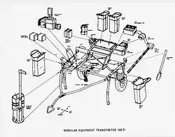 The Modular Equipment Transporter (MET) was a two-wheeled, hand-pulled vehicle that was used as an equipment hauling device on traverses across the lunar surface. Designed after Apollo 12 astronauts Pete Conrad and Alan Bean had difficulties lugging their equipment significant distances to and from their Lunar Module, the MET primarily functioned as a portable workbench with a place for hand tools and their carrier, cameras, spare camera magazines, rock sample bags, environmental sample containers, and the portable magnetometer with its sensor and tripod.[1] It was carried on the 1971 Apollo 14 mission and was planned to be used on Apollo 15, but was used only on Apollo 14 since Apollo 15's mission was changed to be the first to employ the motorized Lunar Roving Vehicle, which transported both astronauts and equipment.