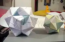 Modular origami or unit origami is a paperfolding technique which uses two or more sheets of paper to create a larger and more complex structure than would be possible using single-piece origami techniques. Each individual sheet of paper is folded into a module, or unit, and then modules are assembled into an integrated flat shape or three-dimensional structure, usually by inserting flaps into pockets created by the folding process. These insertions create tension or friction that holds the model together.