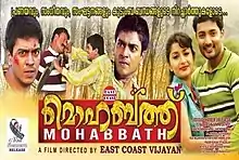 Mohabbath is a 2011 Malayalam-language musical romance film directed and produced by East Coast Vijayan. It stars Meera Jasmine, Munna and Anand Michael in the lead roles. Written by Siddique Shameer based on his own novel Kalippavakal, the film features music by S. Balakrishnan, who makes his comeback through this film. Renowned singer Hariharan appears as himself in a song sequence while Roma does a cameo role.
