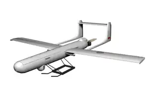 The Mohajer-3, also known as the Dorna, was designed with a new airframe for better performance.[16] It had a square body and featured a low-mounted horizontal stabilizer flush with the main wing, the only member of the Mohajer family configured this way.[16] The Mohajer-3 could be fitted with fixed landing gear, for a runway takeoff, or with skids for a JATO launch.[16] It was recovered by parachute or skid landing.[16] It was powered by an unidentified 25 hp (18.6 kW) piston engine.[2] The Mohajer-3 was announced in 1999.