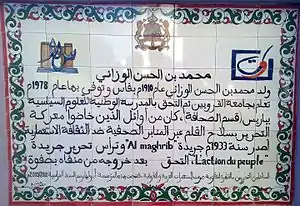Mohamed Hassan Ouazzani was born in 1910 in Fez, and grew up in his hometown, studying at the University of al-Qarawiyyin. In 1927, he went to Paris to pursue his studies in political sciences. In 1933, he founded the nationalist French-speaking newspaper L'Action du Peuple, which was the first anti-colonial French-speaking newspaper in Morocco.[1]