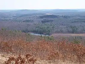 Accessible on foot via the blue-blazed Mohawk Trail (a former alignment of the Appalachian Trail), Red Mountain (elev. 1652 feet) occupies the northernmost section of Mohawk State Forest.[9] Its eastern slope is the site of the Red Mountain Shelter, a log cabin built by CCC crews based in Housatonic State Forest. Due to the shallow bedrock of the peak, the higher elevations of the mountain sport shrubby oak trees and distant vistas.