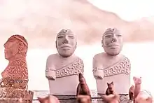 The eyes are wide but narrow, apparently half-closed; there were probably inlaid pieces of shell or stone representing the pupils.[13] The ears are very simply shaped, as on some other stone heads from the site. The back of the top of the head is flat, probably so that something now missing could be attached, and there are various theories as whether it was a carved "bun" or a more elaborate headdress, perhaps in other materials and only worn at times. Two holes below the ears may have been for attaching this, or perhaps a necklace. Mackay suggested the flattening was because the head was damaged, which few later writers agree with. Another possibility is that it was designed to fit into a niche with a sloping top.[14]