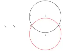 - Given a circle C(r) (in black) and a line AB. We wish to construct the points of intersection, P and Q, between them (if they exist).[14][15]