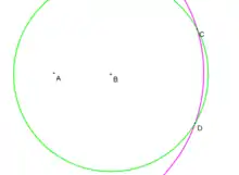 - If C = D (that is, there is a unique point of intersection of the two circles), then C is its own reflection and lies on the line AB (contrary to the assumption), and the two circles are internally tangential.