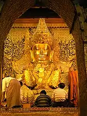 In pre-colonial Burmese kingdoms, the magaik was one of the five articles of regalia used during coronation ceremonies. The magaik also crowns prominent images of the Buddha. The magaik form of the hti, an umbrella that crowns Burmese pagodas, has nine tiers.[4] In modern-day Myanmar, the magaik is worn by dancers when performing classical forms of Burmese dance.