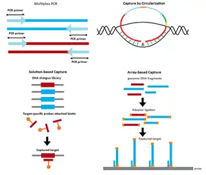 | Capture by Circularization[3][5][6][15][16] | Target capture using probes containing sequences complementary to the target Hybridization of the probes to their targets results in circularized products Target enrichment via rolling circle amplification or PCR using universal primers |