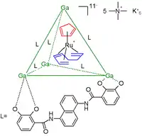 In another example the cage consists of a gallium tetrahedral cluster compound stabilized by 6 bidentate catechol amide ligands residing at the tetrahedron edges. The guest is a 16 electron and thus very reactive ruthenium metallocene (an organometallic catalyst) with a cyclopentadienyl ligand (red) and a 1,3,7-octatriene ligand (blue). The total charge for this anion is 11 and the counterions are 5 tetramethyl ammonium cations and 6 potassium cations. The ruthenium compound decomposes in water within minutes but encapsulated it survives in water for weeks.